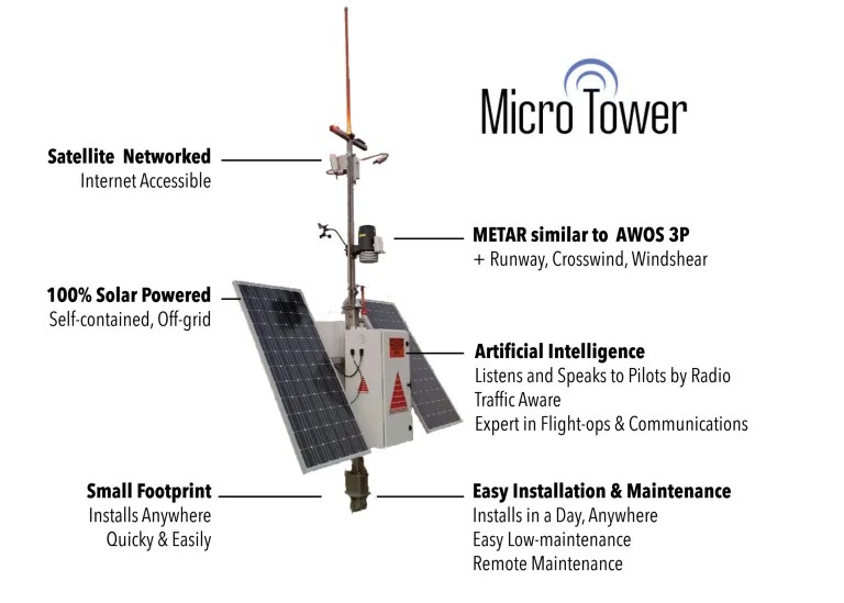 Next-Gen Airport Intelligence The all-in-one, automated intelligence system for smarter, safer airfield operations. See How It Works Artificial Intelligence AVIATION READY Tower-like Services 24/7 At Any Airport or Heliport Assists all Phases of Flight It greets INBOUND PILOTS informing them of its presence and how to use it. It providesCOMPLETE ADVISORIESincluding required weather,traffic, and other information A complete two-way RADIO CHECK Pre-flightPLANNING INFORMATIONfor pilots. Features Real-time VHF Radio Monitoring Weather Sensing (AWOS/METAR integration) Traffic Pattern & Layout Analysis Global Connectivity (e.g., SATCOMM, solarpowered) Benefits Smarter Safety: Reduces risk with faster, info-rich communications Anywhere, Anytime: Functions at remote, towerless airports / heliports / vertiports Pilot Confidence: Reliable, upto- date, and always “on” Global Connectivity (e.g., SATCOMM, solarpowered) LOCATIONS WORLDWIDE 0 + View Select MicroTower Airports